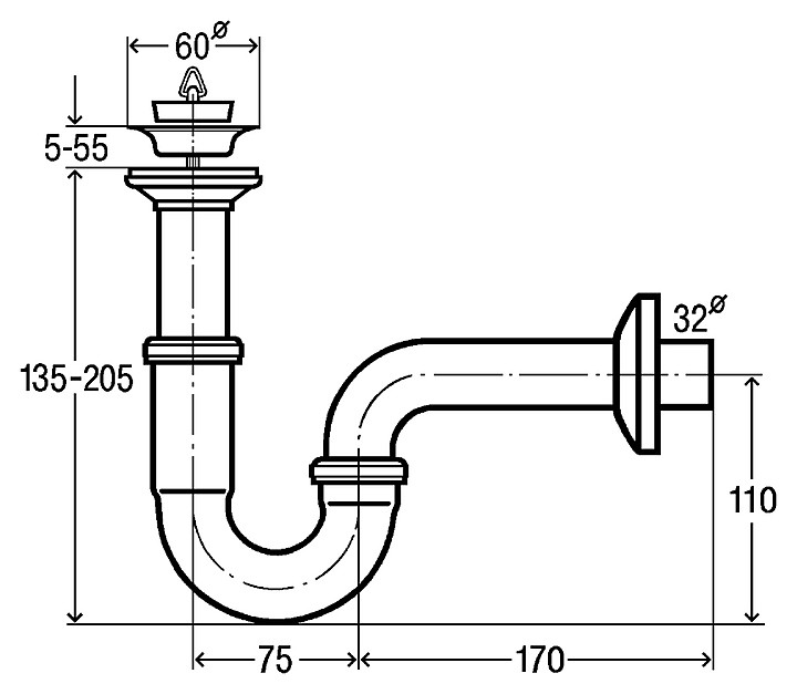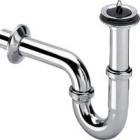 111298 Cифон трубный (металл) с розеткой из нерж, пробкой, патрубок 100 мм, отвод колено 170 мм, 1 1/4 x 32, хром