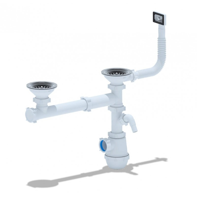 Сифон для кухонной мойки с двумя чашами и сливными отверстиями 90мм. Выход для подключения к канализации 40мм.