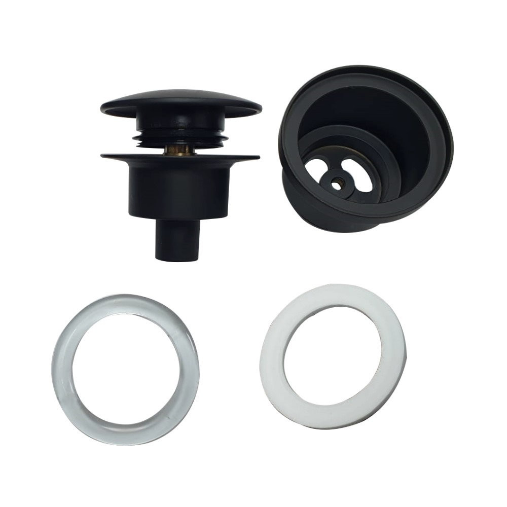 Донный клапан Haiba HB64-7. Данная модель имеет металлический корпус. Крышка черного цвета, выполнена из нержавеющей стали. Силиконовые прокладки обеспечивают плотное прилегание донного клапана к посадочному месту раковины. Без перелива.