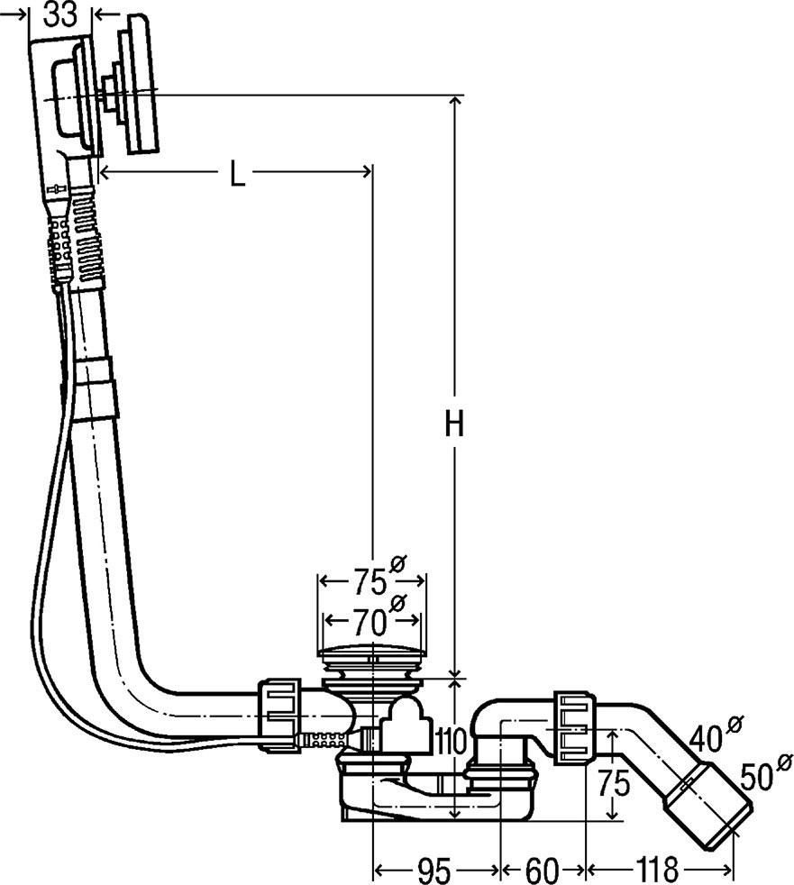 733582 Multiplex Visign M9 Слив-перелив для ванн с центр слив BWL (длин тросика) = 725 мм, DN=40/50, увелич уровня воды на 5 см, мод. 6171.11, хром
