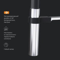 Гибкий излив значительно расширяет зону использования смесителя, гарантирует легкий уход за мойкой и наполнение емкостей любой высоты. Излив изготовлен из термостойкого силикона. Силикон абсолютно безопасен при контакте с водой, т.к. в составе силикона отсутствуют вредные для здоровья токсичные компоненты. Гладкий силиконовый излив устойчив к загрязнениям - легкий уход. Излив износостойкий и устойчив к перегибам.