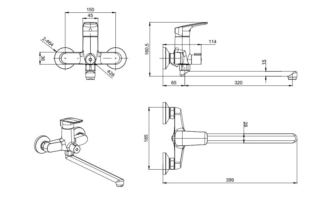 AQ1042CR ВЕГА смеситель для ванны с длинным изливом