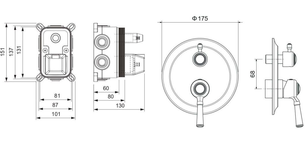 AQ1547PG КЛАССИК смеситель для ванны 3 режима (внешняя и скрытая часть), полир. золото