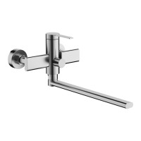Длинный поворотный излив, оснащённый аэратором, позволяет удобно наполнять ванну и способствует экономии воды, делая струю мягче и равномернее. Классический настенный монтаж через эксцентрики с межосевым расстоянием 150 мм обеспечивает простоту установки. В комплекте с смесителем идёт трёхрежимная душевая лейка из ABS-пластика, которая предлагает разнообразные варианты водных процедур, и душевой шланг в двойной металлической оплётке длиной 150 см, что гарантирует его надёжность и долговечность.