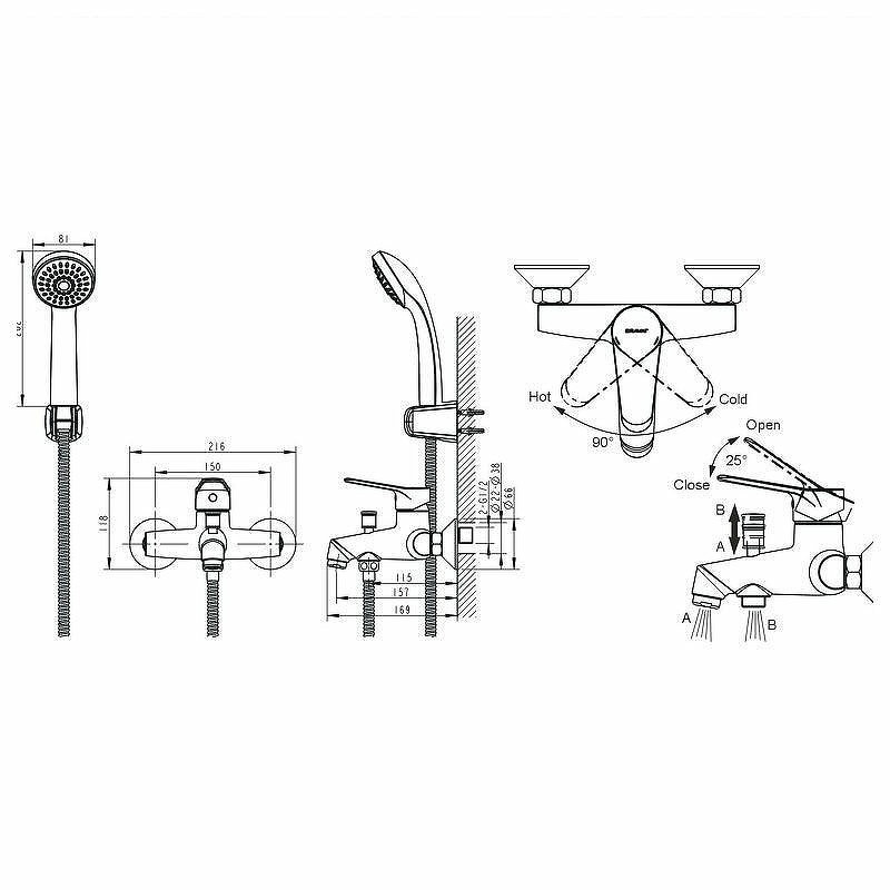 Смеситель для ванны Bravat Emeralda F6135147CP-B-RUS, хром. Душевой гарнитур в комплекте: да. Управление: рычажное. Монтаж: настенный.