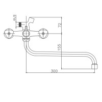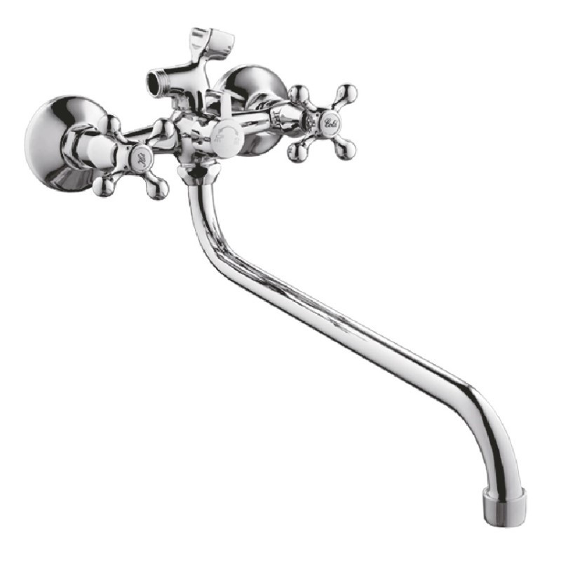 Смеситель изготовлен из металлического сплава. Переключатель потоков на корпусе смесителя. Держатель лейки на корпусе смесителя. Диаметр декоративных чашек 70 мм. Душевой гарнитур в комплекте. Межосевое расстояние (расстояние между выходом горячей и холодной трубы) 150 мм. Данное расстояние изменяется за счет входящих в комплект эксцентриков на 15 мм. в большую или меньшую стороны. Цвет хром
