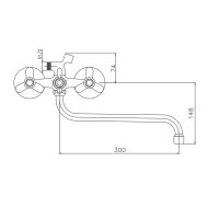 Смеситель изготовлен из металлического сплава. Переключатель потоков на корпусе смесителя. Держатель лейки на корпусе смесителя. Диаметр декоративных чашек 70 мм. Душевой гарнитур в комплекте. Межосевое расстояние (расстояние между выходом горячей и холодной трубы) 150 мм. Данное расстояние изменяется за счет входящих в комплект эксцентриков на 15 мм. в большую или меньшую стороны. Цвет хром