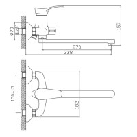 Керамический картридж 35 мм. Смеситель изготовлен из металлического сплава. Переключатель потоков на корпусе смесителя. Диаметр декоративных чашек 70 мм. Душевой гарнитур в комплекте. Межосевое расстояние (расстояние между выходом горячей и холодной трубы) 150 мм. Данное расстояние изменяется за счет входящих в комплект эксцентриков на 15 мм. в большую или меньшую стороны. Цвет хром