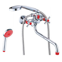 Смеситель изготовлен из металлического сплава. Переключатель потоков на корпусе смесителя. Держатель лейки на корпусе смесителя. Диаметр декоративных чашек 70 мм. Душевой гарнитур в комплекте. Межосевое расстояние (расстояние между выходом горячей и холодной трубы) 150 мм. Данное расстояние изменяется за счет входящих в комплект эксцентриков на 15 мм. в большую или меньшую стороны. Цвет хром/красный
