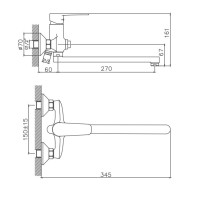 Керамический картридж 35 мм. Смеситель изготовлен из металлического сплава. Переключатель потоков на корпусе смесителя. Переключение потока воды на лушевой гарнитур осуществляется путём нажатия кнопки. Диаметр декоративных чашек 70 мм. Душевой гарнитур в комплекте. Межосевое расстояние (расстояние между выходом горячей и холодной трубы) 150 мм. Данное расстояние изменяется за счет входящих в комплект эксцентриков на 15 мм. в большую или меньшую стороны. Цвет хром