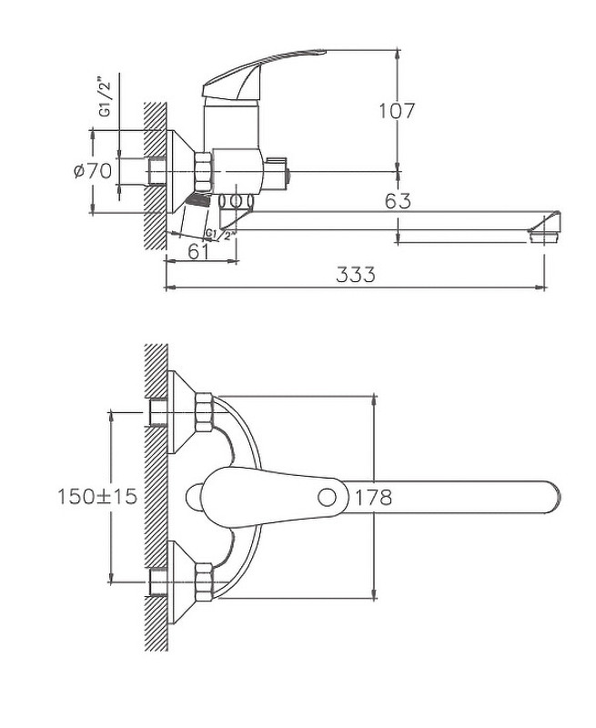 Керамический картридж 40 мм. Смеситель изготовлен из металлического сплава. Переключатель потоков на корпусе смесителя. Диаметр декоративных чашек 70 мм. Душевой гарнитур в комплекте. Межосевое расстояние (расстояние между выходом горячей и холодной трубы) 150 мм. Данное расстояние изменяется за счет входящих в комплект эксцентриков на 15 мм. в большую или меньшую стороны. Цвет хром
