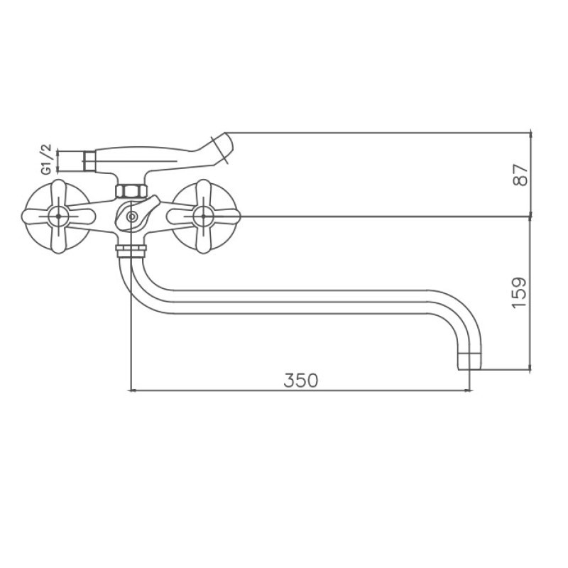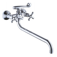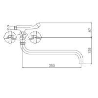 Смеситель изготовлен из металлического сплава. Переключатель потоков на корпусе смесителя. Держатель лейки на корпусе смесителя. Диаметр декоративных чашек 70 мм. Душевой гарнитур в комплекте. Межосевое расстояние (расстояние между выходом горячей и холодной трубы) 150 мм. Данное расстояние изменяется за счет входящих в комплект эксцентриков на 15 мм. в большую или меньшую стороны. Цвет хром