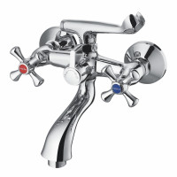 Смеситель изготовлен из металлического сплава. Переключатель потоков на корпусе смесителя. Диаметр декоративных чашек 70 мм. Душевой гарнитур в комплекте. Межосевое расстояние (расстояние между выходом горячей и холодной трубы) 150 мм. Данное расстояние изменяется за счет входящих в комплект эксцентриков на 15 мм. в большую или меньшую стороны. Цвет хром