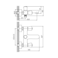 Смеситель изготовлен из металлического сплава. Переключатель потоков на корпусе смесителя. Диаметр декоративных чашек 60 мм. Душевой гарнитур в комплекте. Межосевое расстояние (расстояние между выходом горячей и холодной трубы) 150 мм. Данное расстояние изменяется за счет входящих в комплект эксцентриков на 15 мм. в большую или меньшую стороны. Цвет хром