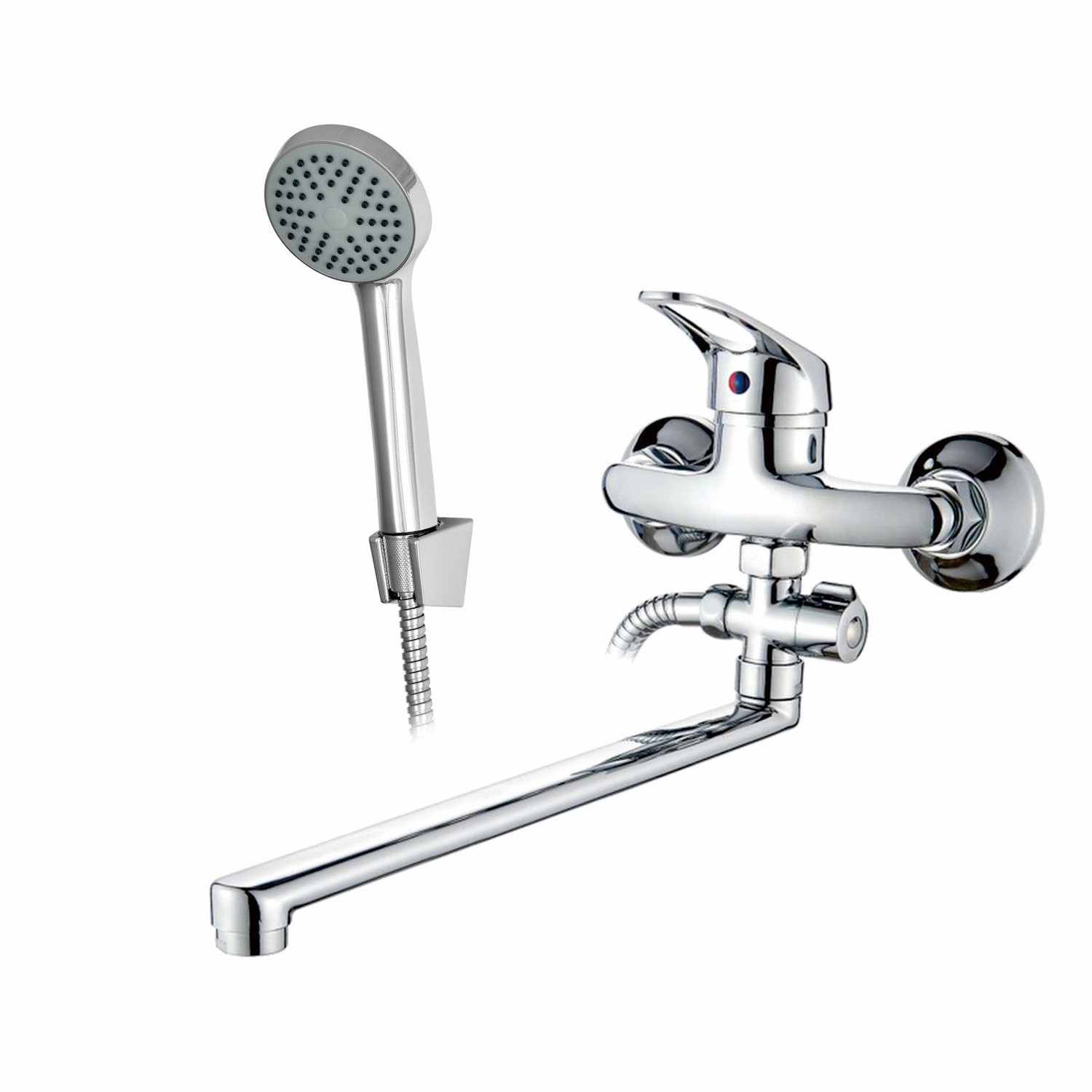 Комплектация: Смеситель, шланг, душевая лейка, держатель душевой лейки, эксцентрики, инструкция;