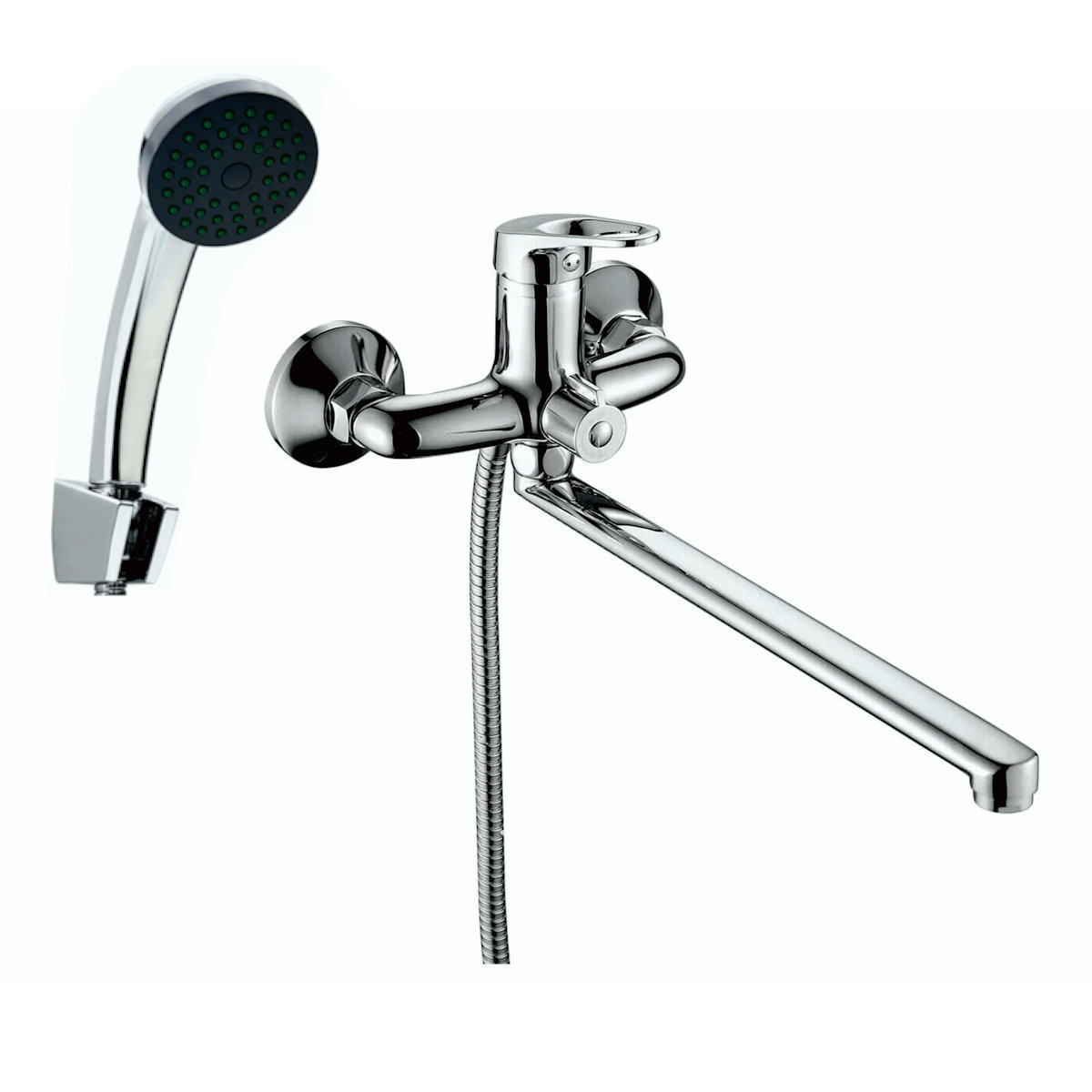 Комплектация: Смеситель, шланг, душевая лейка, держатель душевой лейки, эксцентрики, инструкция;