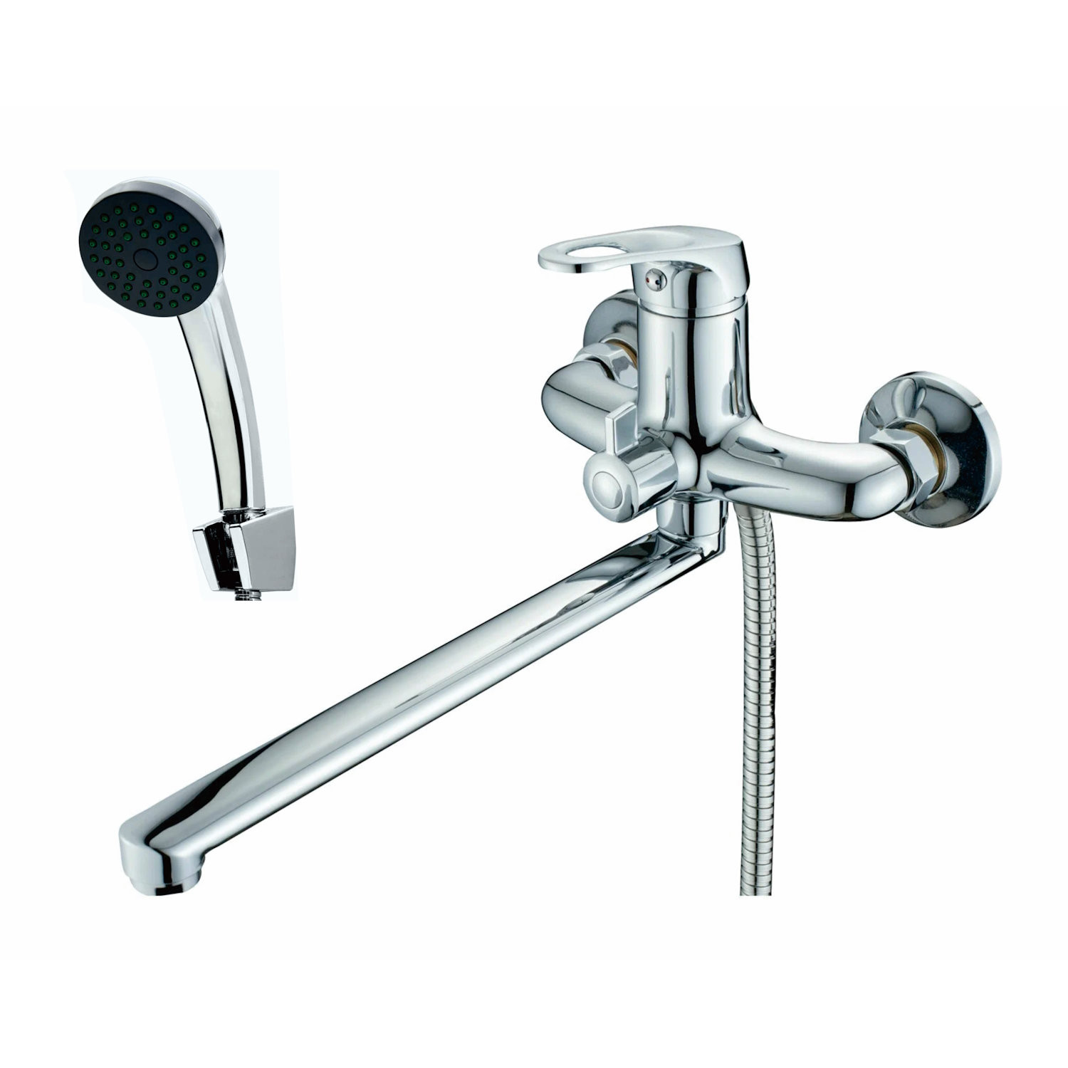 Комплектация: Смеситель, шланг, душевая лейка, держатель душевой лейки, эксцентрики, инструкция;