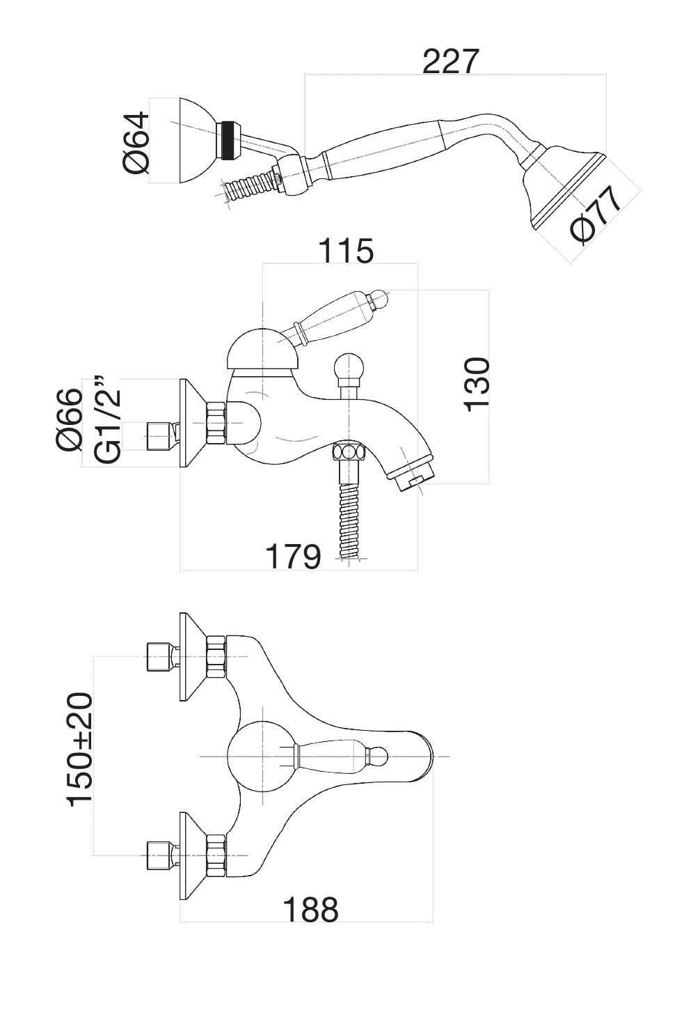 Комплектация: смеситель, душевая лейка, шланг;