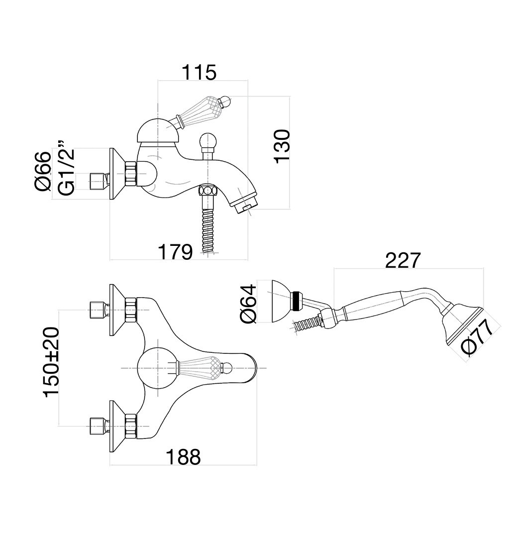 Комплектация: смеситель, душевая лейка, шланг;