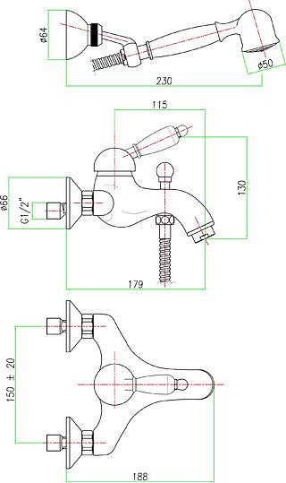 Комплектация: смеситель, душевая лейка, шланг, инструкция;
