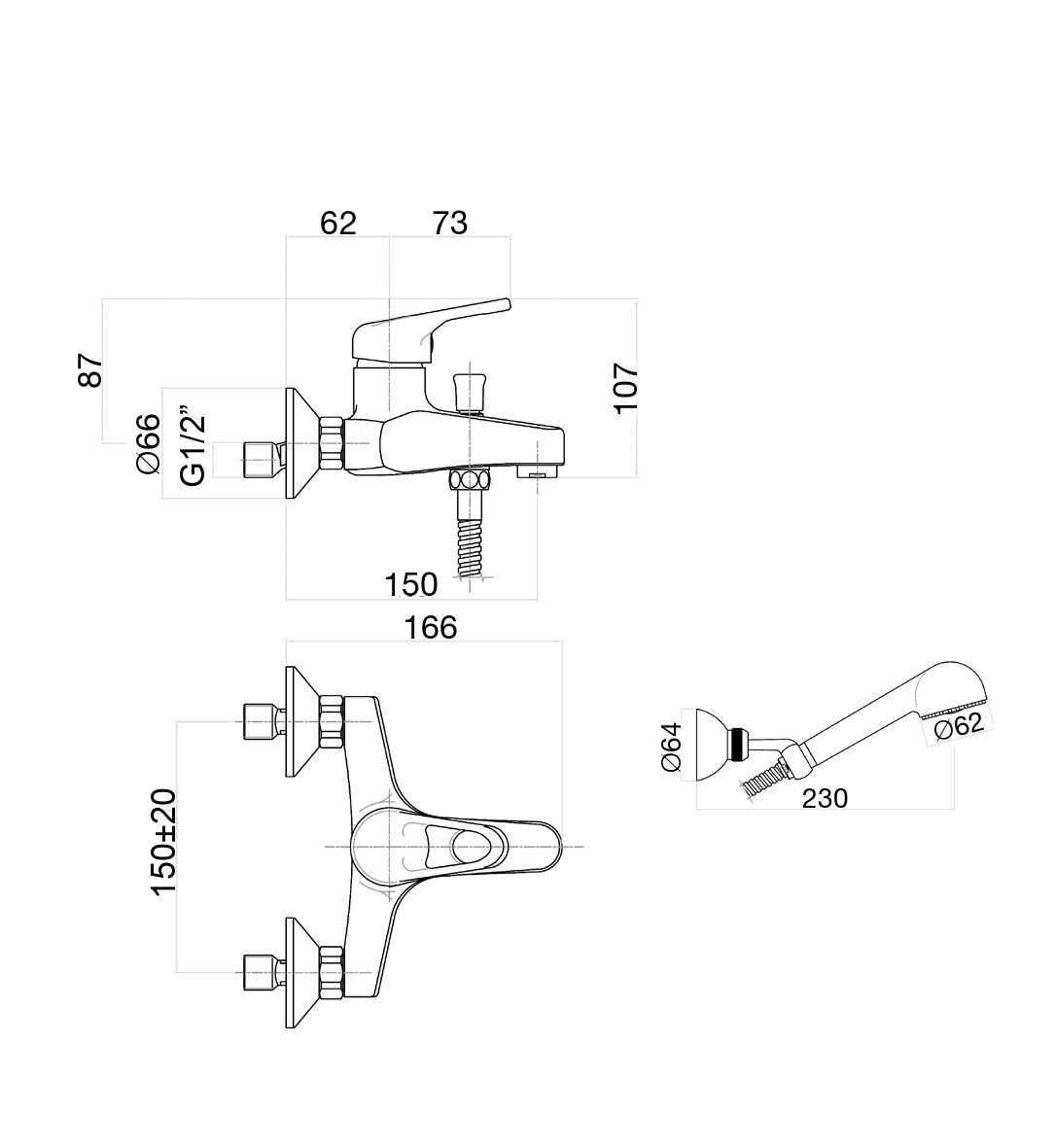 Комплектация: смеситель, душевая лейка, держатель лейки, шланг;