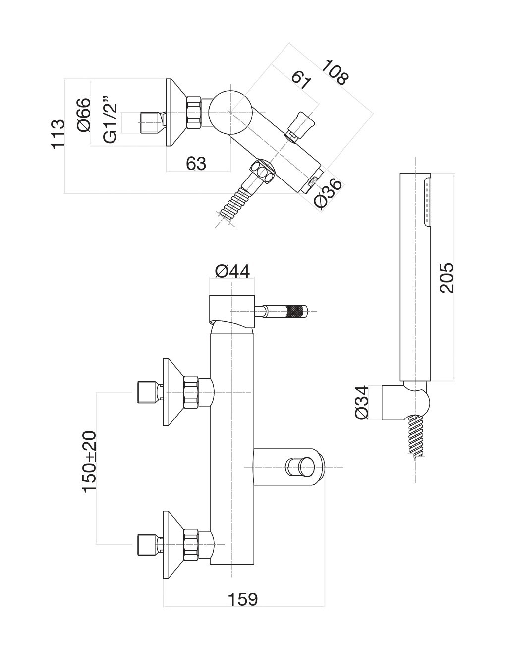 Комплектация: смеситель, душевая лейка, держатель лейки, шланг;