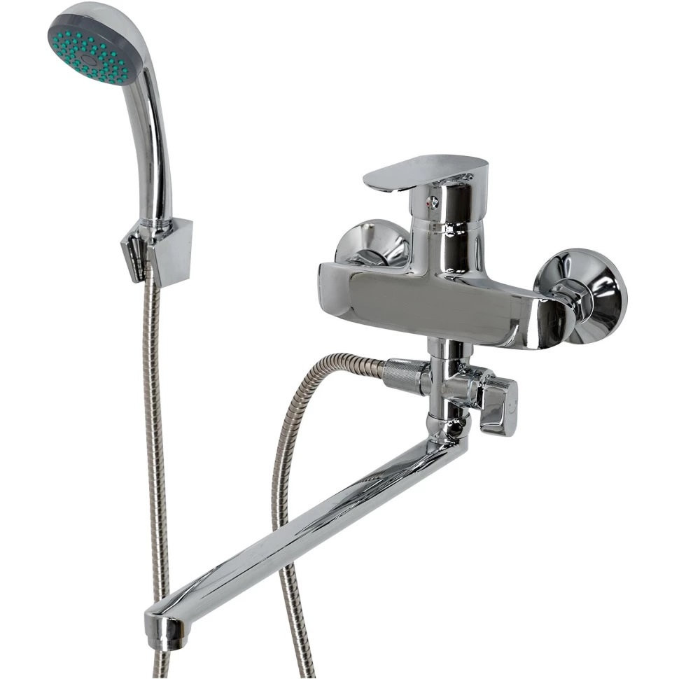 Комплектация: смеситель, душевая лейка, шланг, эксцентрики, настенный держатель;
