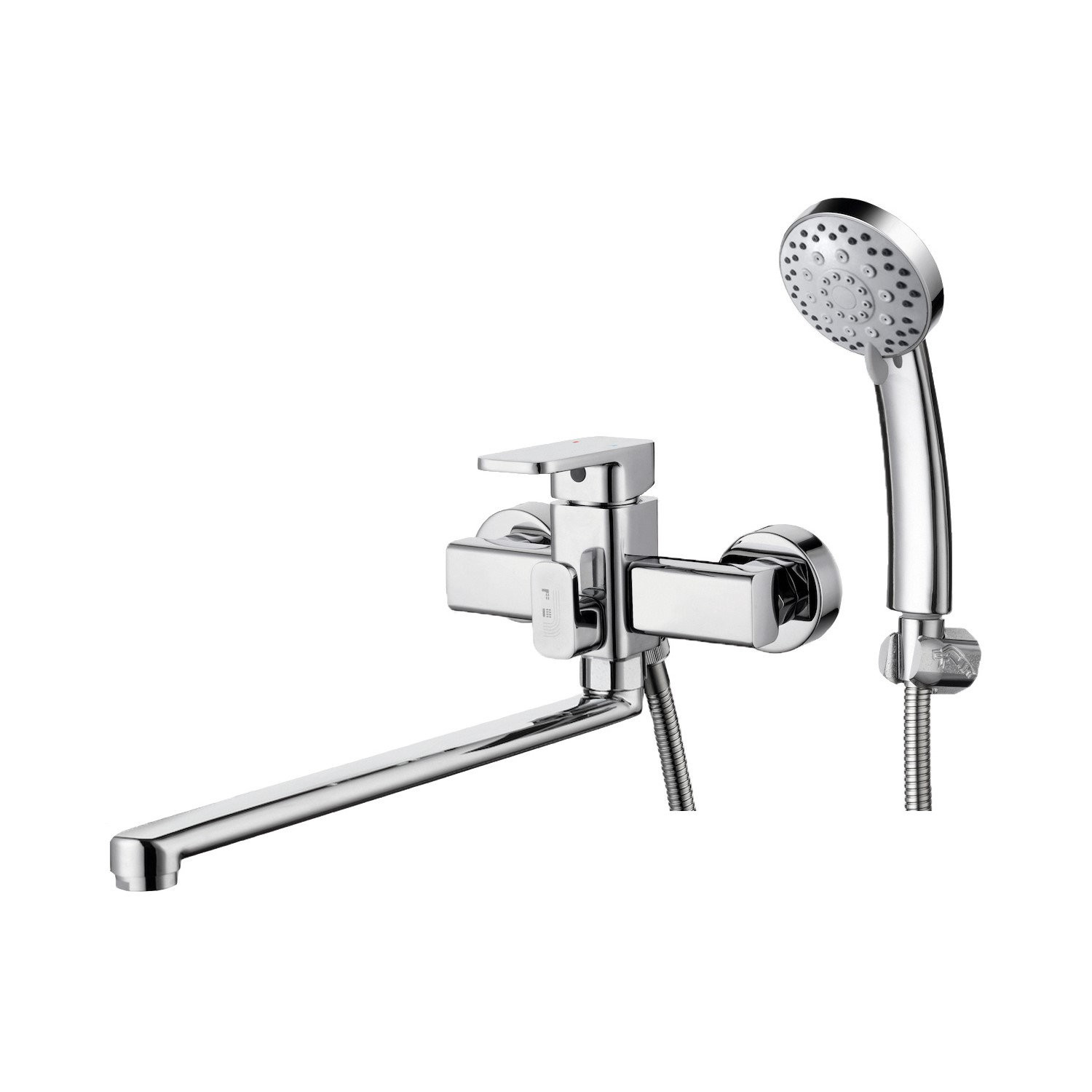 Комплектация: смеситель, душевая лейка, настенный держатель душевой лейки, душевой шланг, эксцентрики, декоративные отражатели;