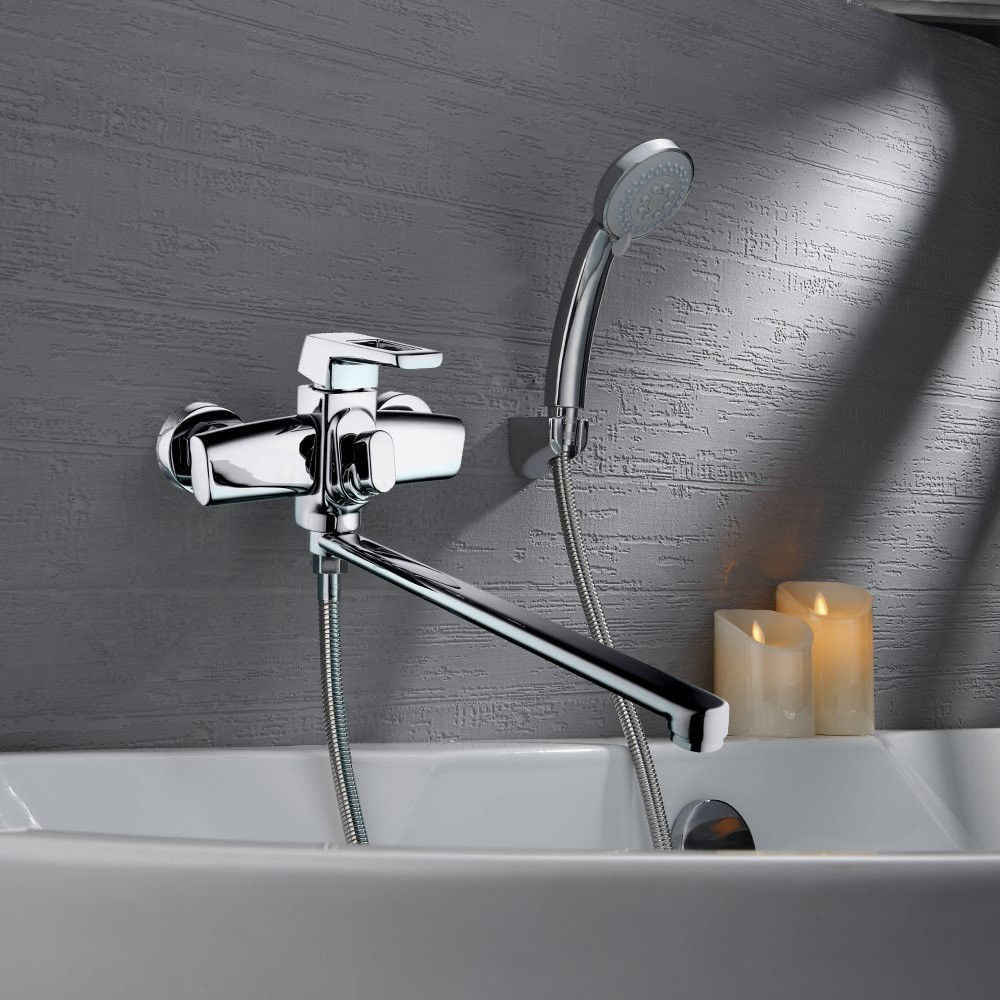 Комплектация: смеситель, душевая лейка, настенный держатель душевой лейки, душевой шланг, эксцентрики, декоративные отражатели;
