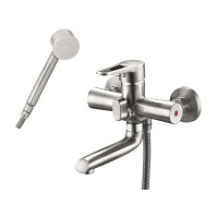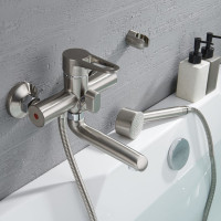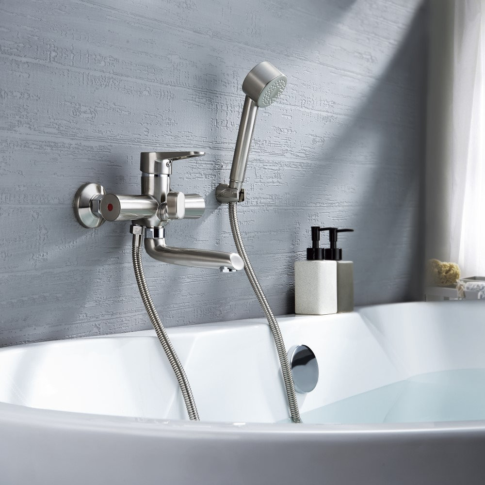 Комплектация: смеситель, душевая лейка, настенный держатель душевой лейки, душевой шланг, эксцентрики, декоративные отражатели;