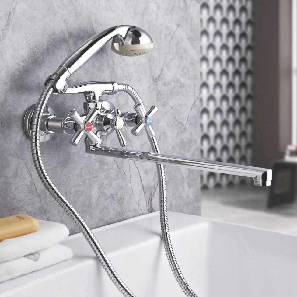 Комплектация: смеситель, душевая лейка, настенный держатель душевой лейки, душевой шланг, эксцентрики, декоративные отражатели;