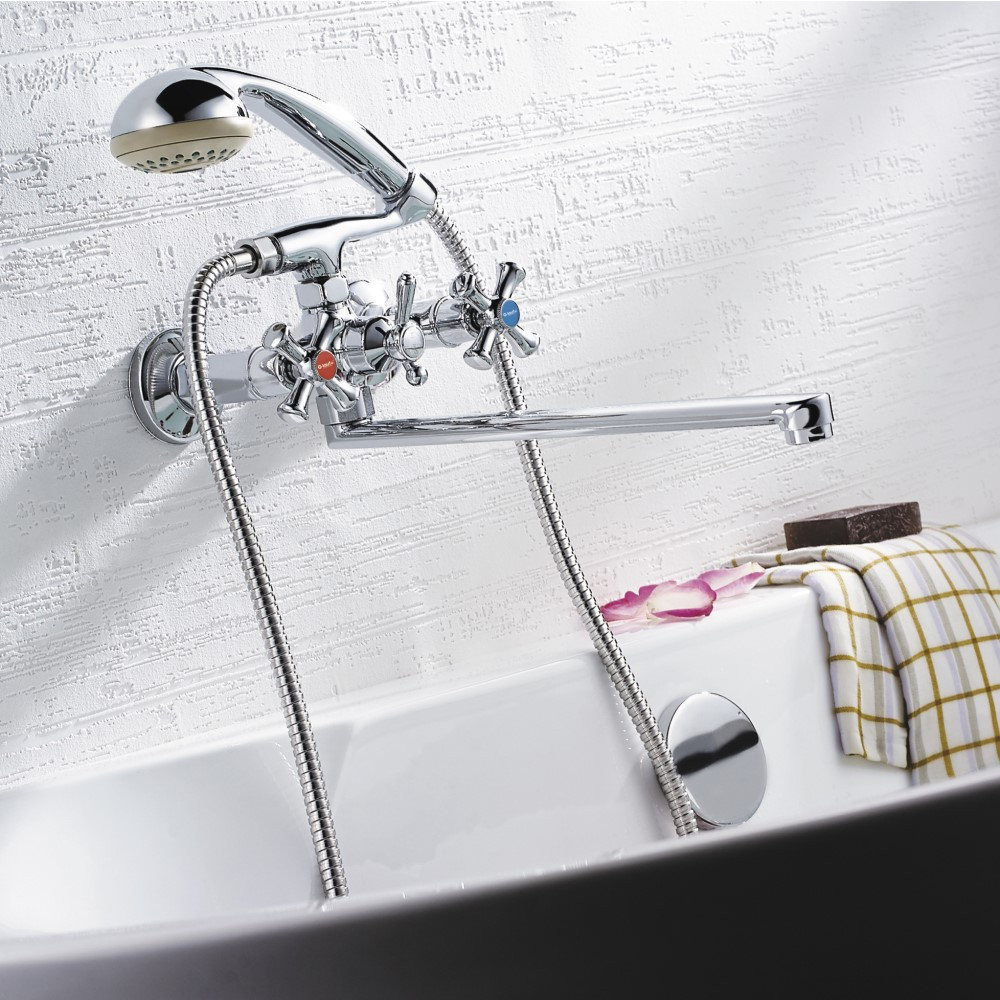 Комплектация: смеситель, душевая лейка, настенный держатель душевой лейки, душевой шланг, эксцентрики, декоративные отражатели;
