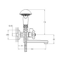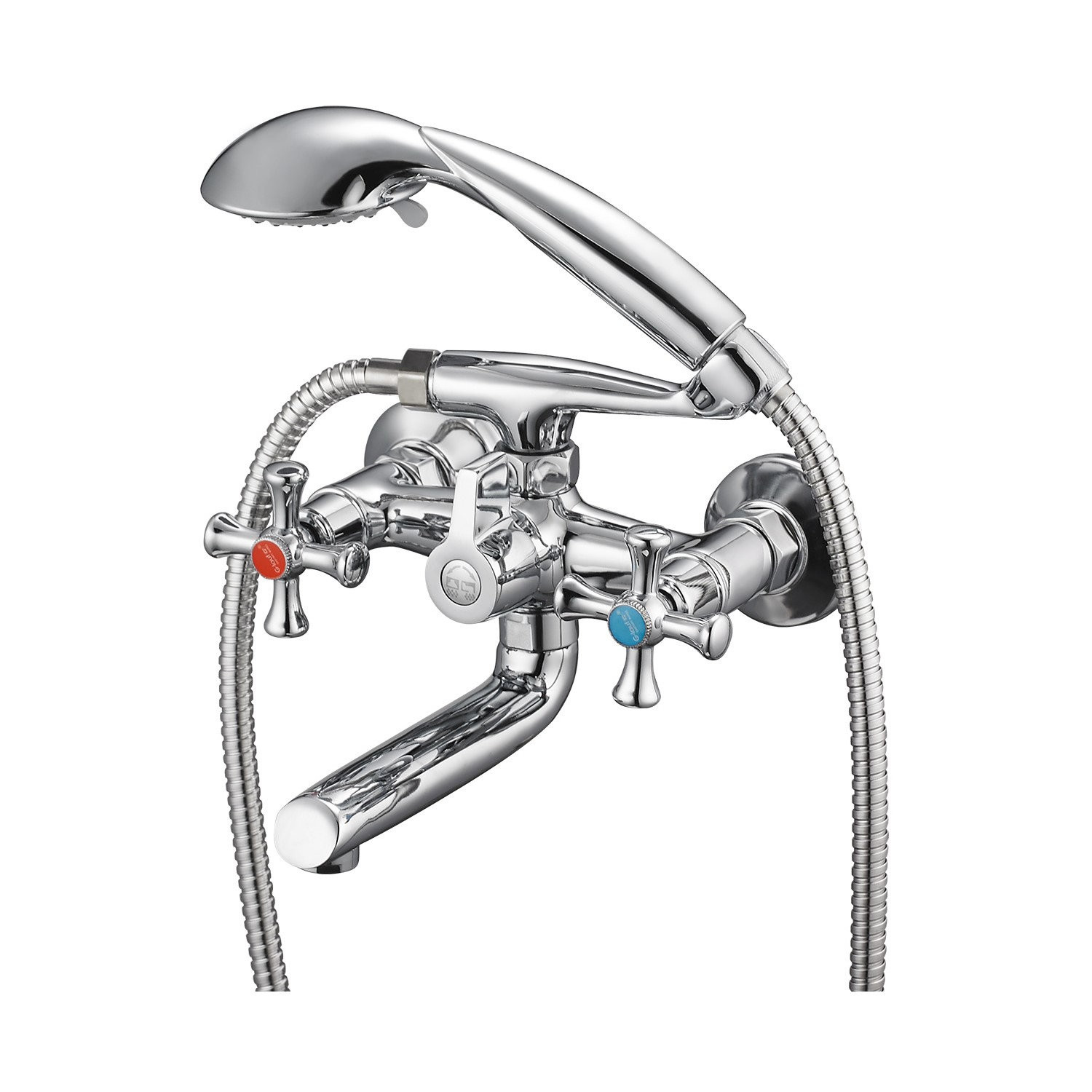 Комплектация: смеситель, душевая лейка, настенный держатель душевой лейки, душевой шланг, эксцентрики, декоративные отражатели;