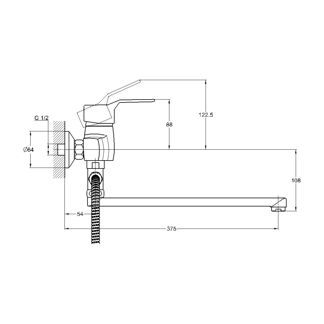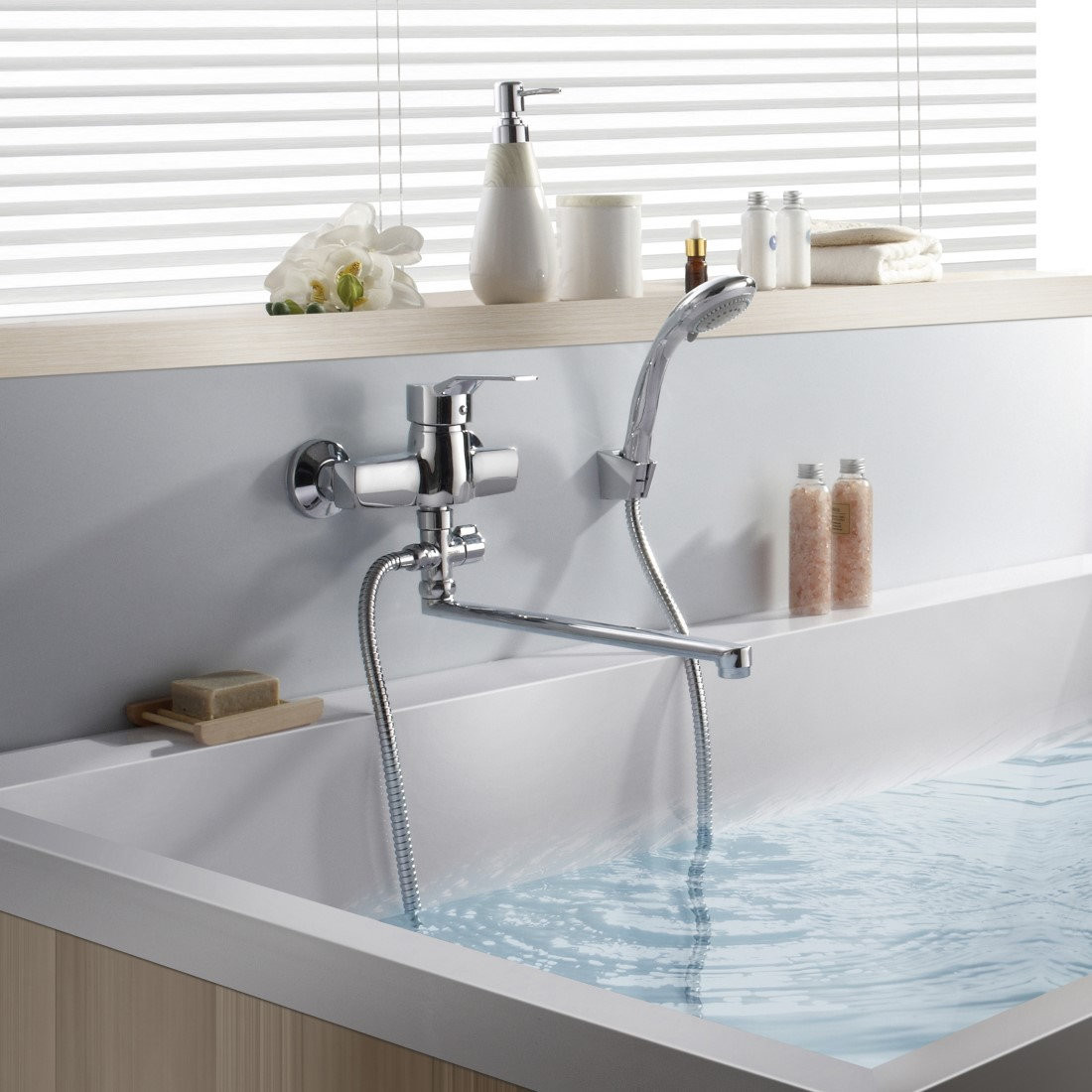 Комплектация: смеситель, душевая лейка, настенный держатель душевой лейки, душевой шланг, эксцентрики, декоративные отражатели;