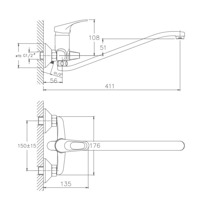 Керамический картридж 35 мм. Диаметр декоративных чашек 70 мм. Душевой гарнитур в комплекте. Межосевое расстояние (расстояние между выходом горячей и холодной трубы) 150 мм. Данное расстояние изменяется за счет входящих в комплект эксцентриков на 15 мм в большую или меньшую стороны.