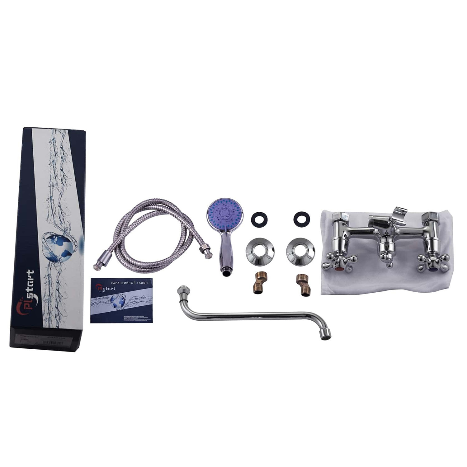 Комплектация: смеситель, лейка, шланг, держатель лейки, отражатели, эксцентрики;