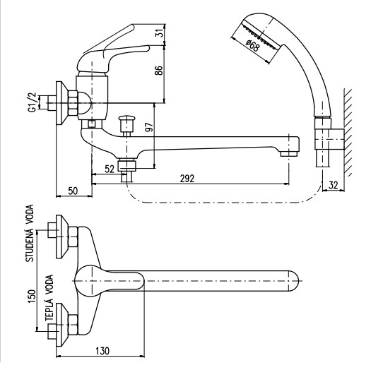 Комплектация: смеситель, душевая лейка, шланг, инструкция;