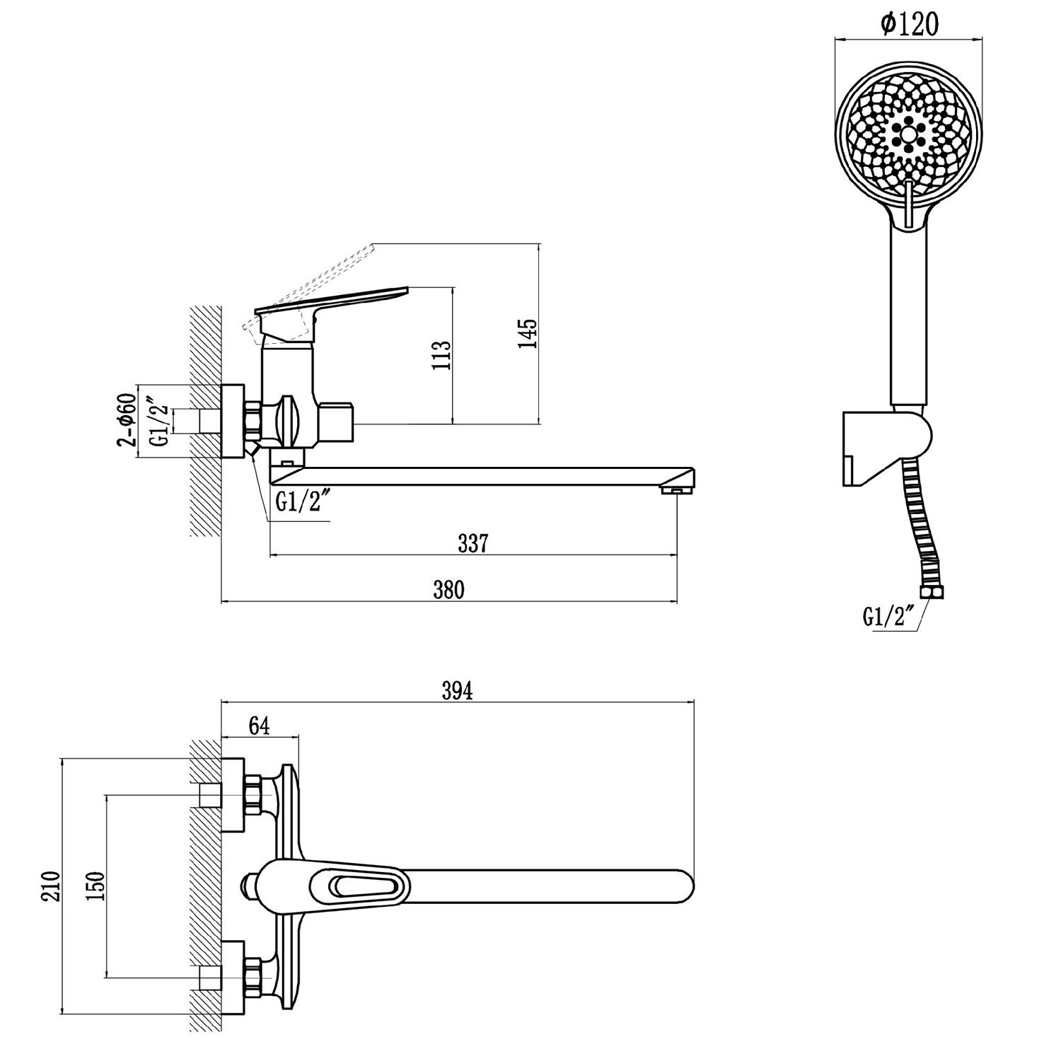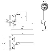 Комплектация: смеситель, душевая лейка, шланг, эксцентрики, настенный держатель;