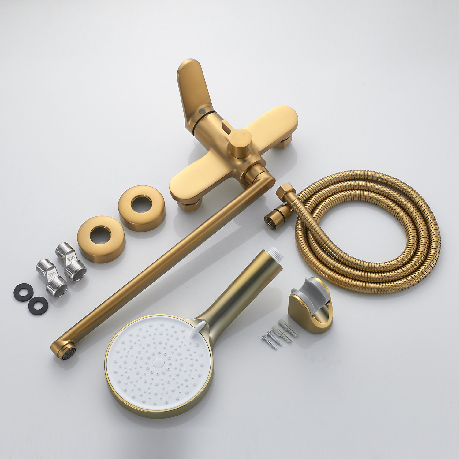 Комплектация: смеситель, эксцентрики, декоративные чашки, лейка, шланг, держатель лейки;