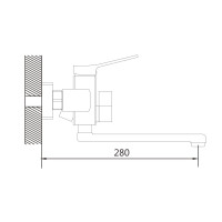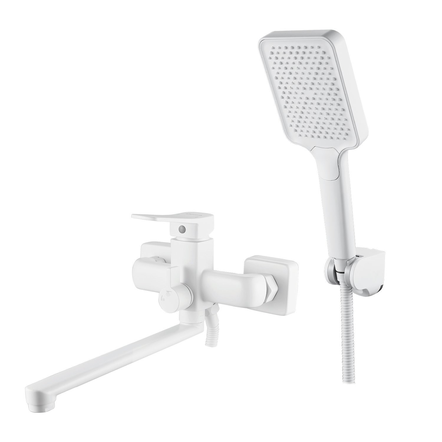 Смеситель оснащён длинным поворотным изливом и двухрежимной душевой лейкой из ABS-пластика. В комплекте поставки эксцентрики, настенный держатель душевой лейки и душевой шланг длиной 150 см. На смеситель предоставляется гарантия 5 лет.