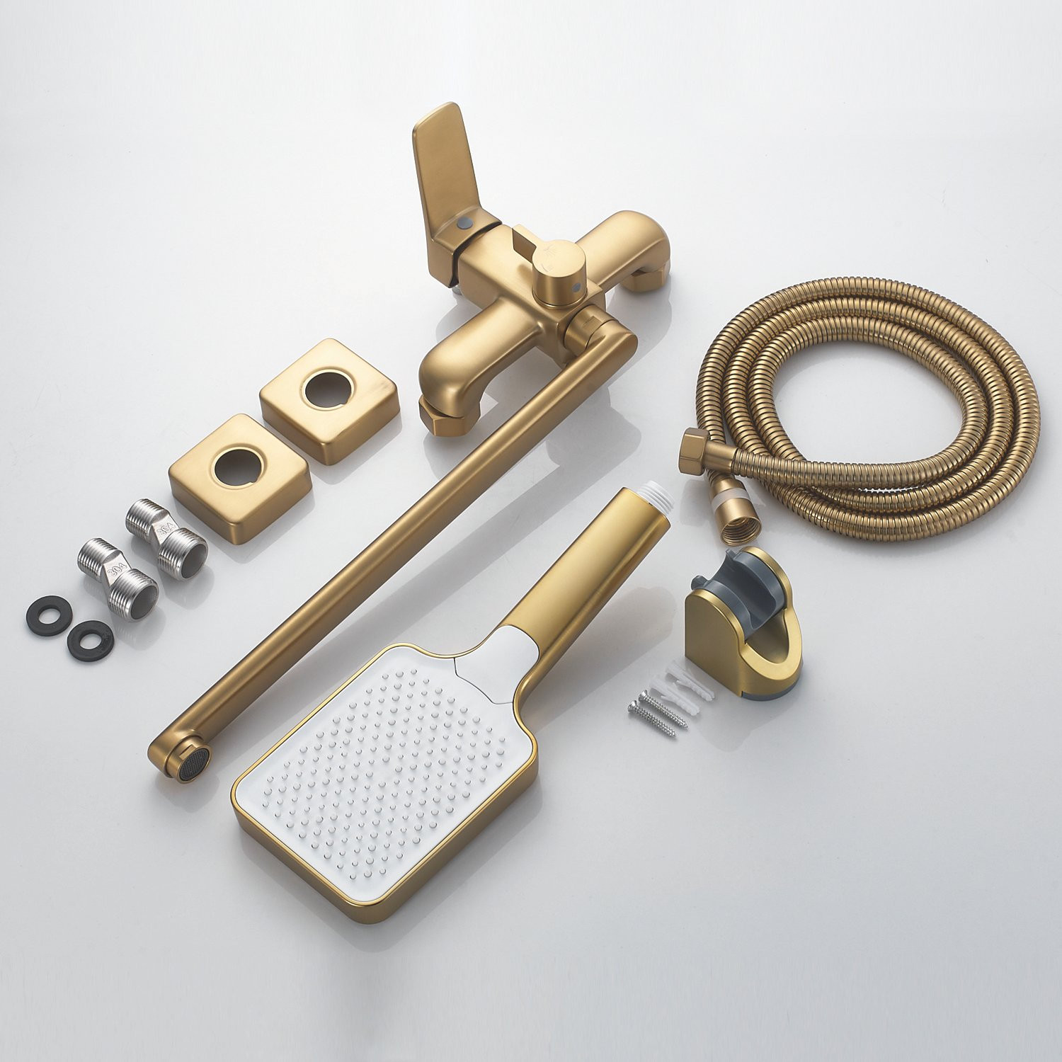 Комплектация: смеситель, эксцентрики, декоративные чашки, лейка, шланг, держатель лейки;