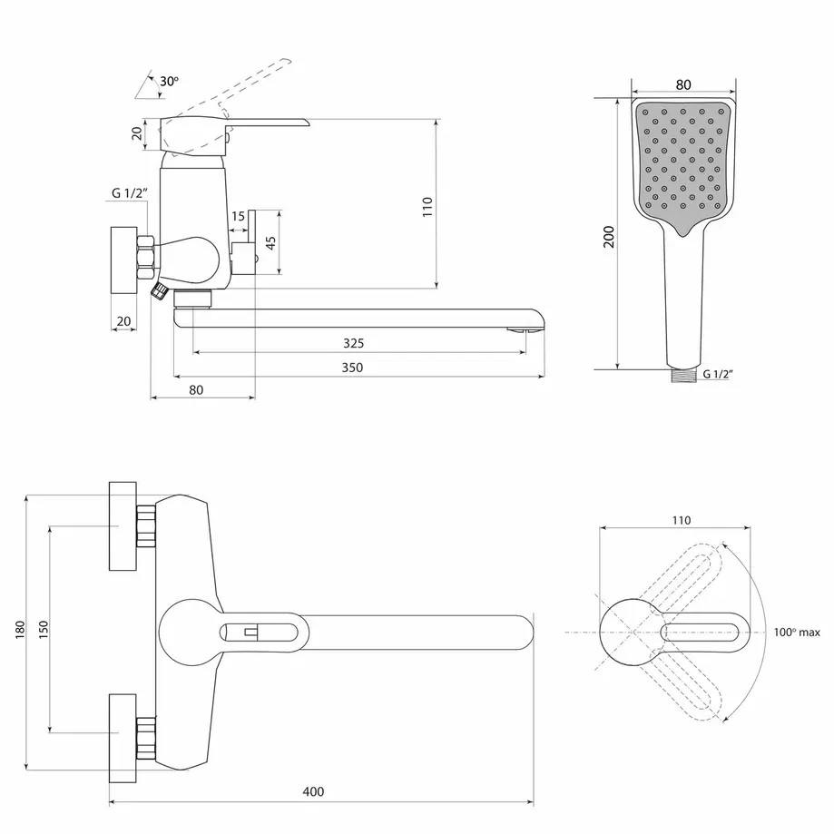 Комплектация: Смеситель, шланг, душевая лейка, держатель душевой лейки, эксцентрики, декоративные отражатели;