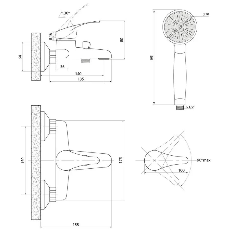 Тип крепления лейки: Крепление вертикальное, настенное;