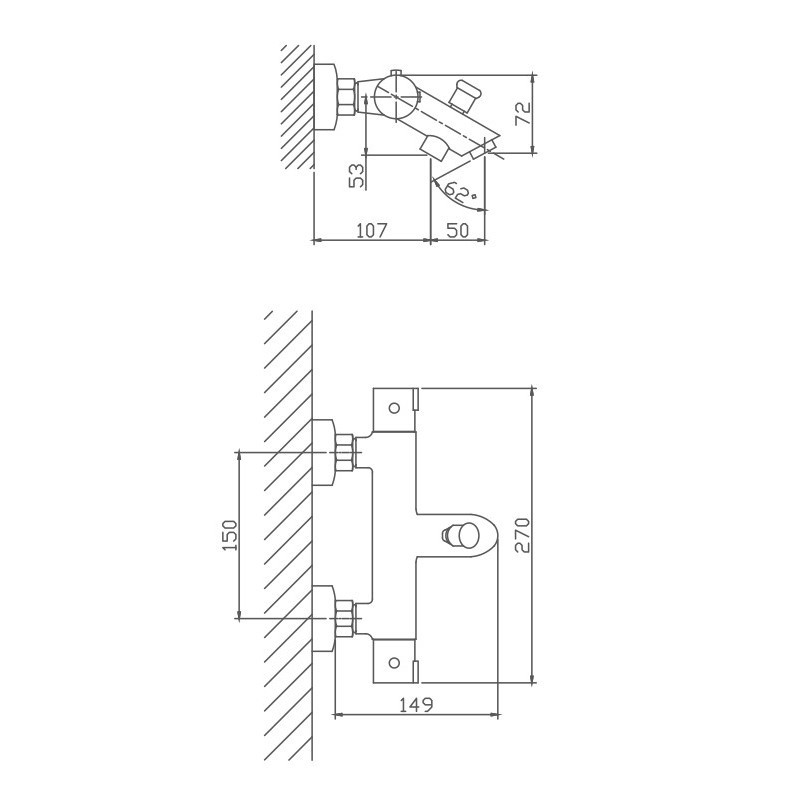 Смеситель для ванны с термостатом. Керамический картридж 35 мм. Диаметр декоративных чашек 60 мм. Душевой гарнитур в комплекте. Межосевое расстояние (расстояние между выходом горячей и холодной трубы) 150 мм. Данное расстояние изменяется за счет входящих в комплект эксцентриков на 10 мм в большую или меньшую стороны.
