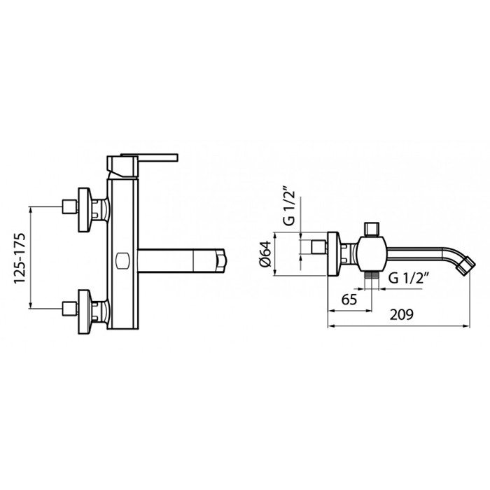 - Однорычажный настенный смеситель для ванны, устанавливаемый на два отверстия, без душевого гарнитура.
