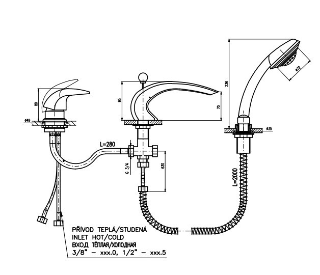 Rav Slezak Dunaj D472.5S каскадный смеситель для ванны. Врезной на 3 отверстия. В состав комплекта входит: переключатель в изливе, керамический картридж 40 мм, душевой шланг с пружиной, душевая лейка, гибкая подводка 1/2.