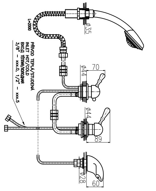 Rav Slezak Labe Mosaz L570.5PSM каскадный смеситель для ванны. Врезной на 4 отверстия. В состав комплекта входит: керамический переключатель, керамический картридж 35 мм, душевой шланг с пружиной, душевая лейка, гибкая подводка 1/2.