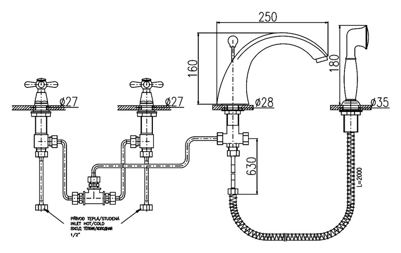Принцип установки:смеситель ставится в специальные посадочные места в ванной. Предусмотрены места для установки двух кранбукс, одного излива и ручного душа. Ручной душ оснащен пружиной, которая упрощает возвращение шланга в посадочное место.
