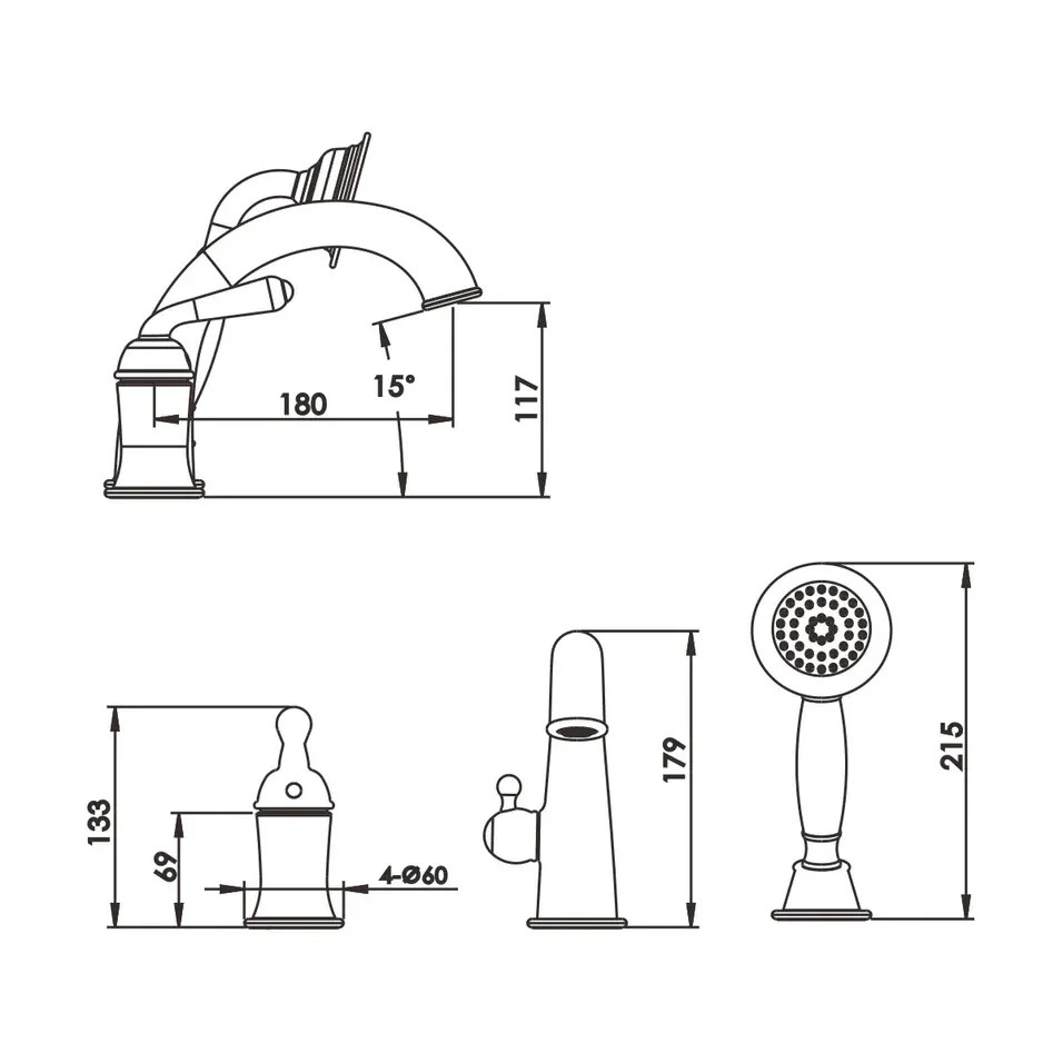 Комплектация: смеситель, лейка, шланг, держатель лейки, излив;