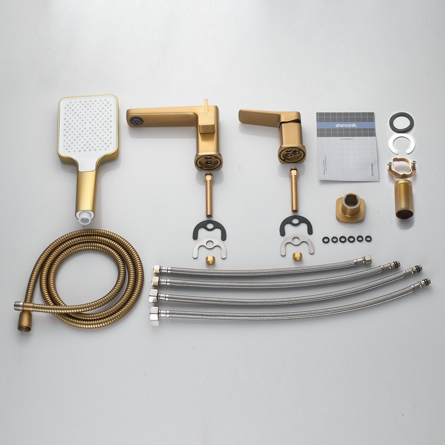Комплектация: смеситель,излив с переключателем потоков, лейка, шланг, держатель лейки, гибкая подводка, комплект креплений;